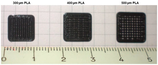 However, the manufacture of the 3D scaffold in PLA material was possible in the three pore sizes. Figure 5 shows the printed 3D scaffolds.