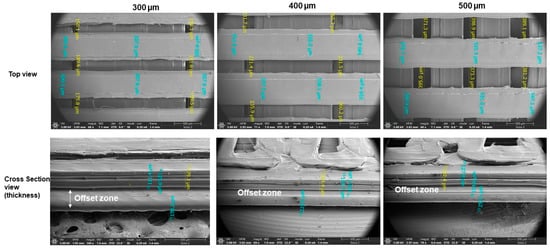 SEM analyses of 300, 400 and 500 µm. The figure contains images to measure the pore size, the molten layers deposited in the top view and the thickness of the 3D scaffolds in the cross-section view.