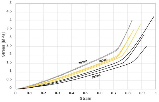 Figure 7 shows the stress-strain curves for both 3D scaffolds (300; 400; 500 μm). The mechanical properties were analyzed based on uniaxial compression tests. The 3D scaffolds showed a compressive strength of 3.9 ± 0.1, 3.4 ± 0.3, and 3.3 ± 0.9 MPa; an elastics modulus of: 2.0 ± 0.3, 1.5 ± 0.2, 0.9 ± 0.1 MPa; and a maximum strain before crush of 82.8 ± 0.7, 84.9 ± 3.9, and 94.5 ± 3.7%. As shown in the following curves, Young’s modulus decreases with increasing mesh size. Thus, the higher the pore value, the less resistance to damage for the interior walls of the pieces in the yield. This becomes evident in the variability of the replicas corresponding to 500 μm. On the contrary, stiffness is higher, and repeatability of the replicas is very high in the other two sizes. This characteristic reveals that small pore sizes better support viscous stresses applied in the center, where buckling stresses are most critical. The lower Young’s modulus of all the 3D scaffolds suggests that the sample has a similar behavior under load, a higher elastic character and withstands greater deformation. The stress-strain curve shows a first elastic region until reaching 25–30% deformation, when the material behaves like a foam material (with a certain viscoelasticity). Subsequently, the curve presents an elastic zone where the densification remains practically constant up to the yield point. From there, a hardening takes place due to the deformation up to the crush of the structure without rupture. The mechanical properties obtained by the 3D scaffolds are similar to structures of hydroxyapatite, silica, and gelatine that have maximum strain stress of 3.8 ± 1.1 MPa or compositions of gelatine, carbox-ymethyl chitosan, and β-TCP with maximum values of 2.5 ± 0.2 MPa [43].