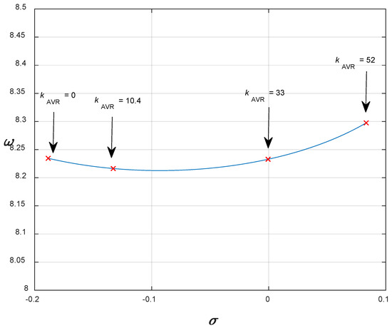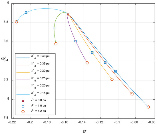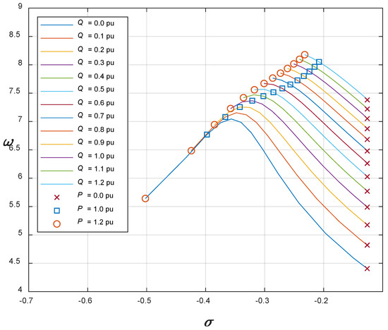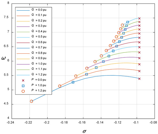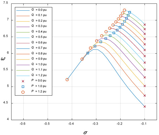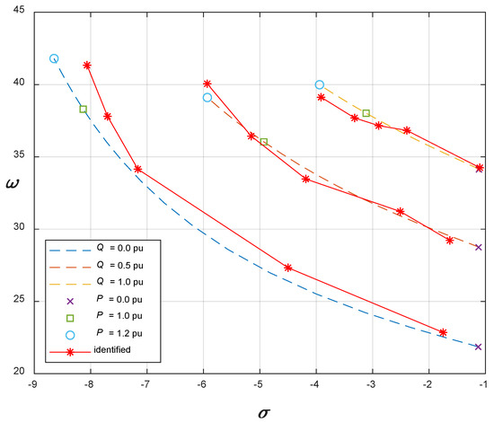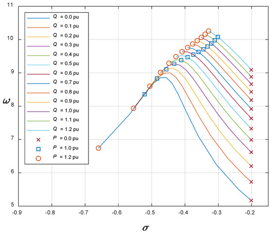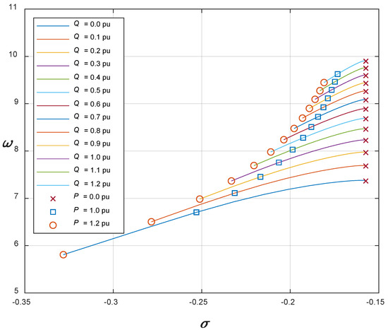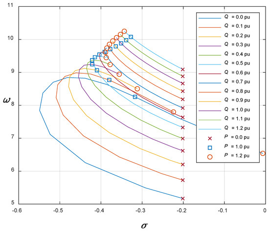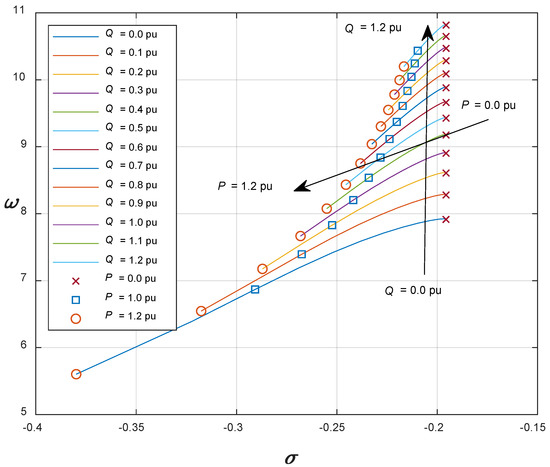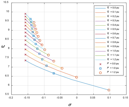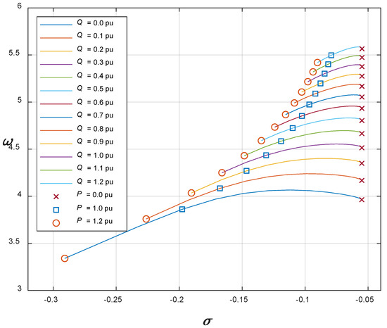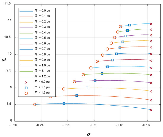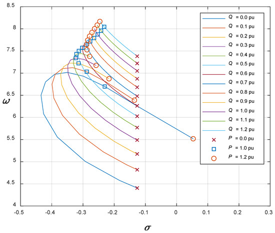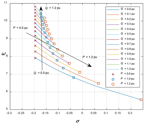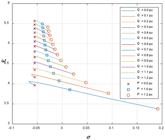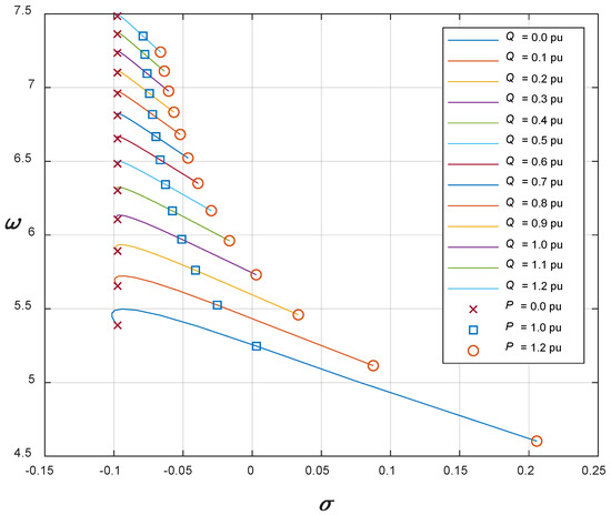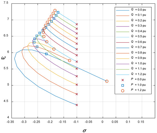 Eigenvalue analysis was carried out for 48 turbo-generators. For all generators, similar eigenvalue loci were obtained, as shown in Figure 5, Figure 6 and Figure 7. The eigenvalue loci of turbo-generators differ from the loci of hydro-generators in that the loci of the constant reactive power of turbo-generators are not so straightforward, especially for the curves of low reactive power, whose convexity is evident in the vicinity of the nominal values of the active power. The primary conclusions that the increase in active power decreases the real part σ, and that the increase in reactive power increases the imaginary part ω, still apply. Additionally, the oscillations are better damped at operating points with high values of active power and low values of reactive power. The damping is smaller at high values of reactive power and low values of active power.