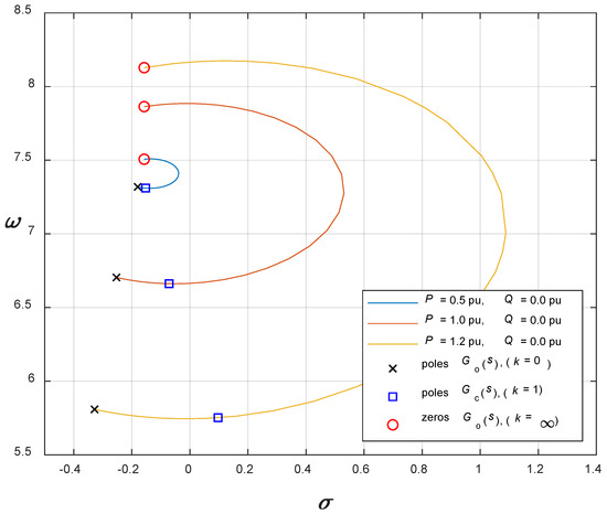 Turbo-type synchronous generators of nominal powers were analyzed in the range of 25 MVA to 911 MVA, with data in Appendix A, Table A5, Table A6 and Table A7. The same eigenvalue analysis was performed as for hydro-generators. Figure 5, Figure 6 and Figure 7 show the eigenvalue loci as a function of operating point for synchronous generators with nominal powers 25 MVA, 160 MVA, and 911 MVA.