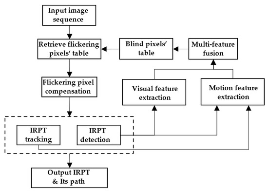 As shown in Figure 1, the proposed method is embedded in a IRPT detection process and, the block diagram briefly summarizes the processing steps of the proposed method including visual feature extraction, motion feature extraction, multi-feature fusion, and blind pixel compensation.