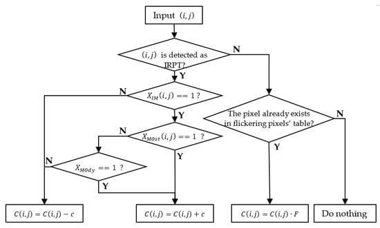Especially, a threshold was introduced to maintain the scale of flickering pixels’ table. is the reserve threshold and is set to 0.5 . When CFP of a pixel is greater than , the pixel will be added to the flickering pixels’ table. Otherwise, it will be removed from the table. In addition, due to changes in working conditions, some flickering pixels will return to normal. Therefore, we introduce forgetting factor (F) with values from 0.96 to 0.98. If a certain pixel within the flickering pixels’ table is not updated CFP in the current frame, the CFP of this pixel will be decreased by multiplying the forgetting factor. The block diagram of proposed confidence evaluation mechanism of flickering pixel is shown in Figure 3.