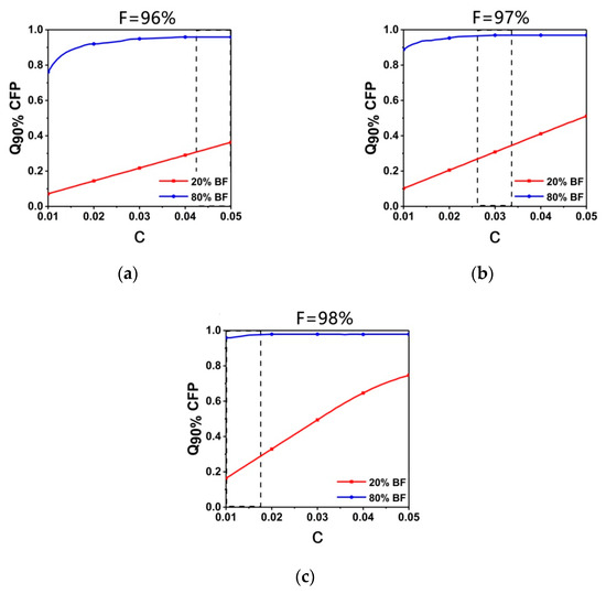 Finally, the above parameters and thresholds selection are discussed. Indeed, these values are important because they determine the effect of flickering pixel suppression. The CFP fluctuates nonlinearly with the forgetting factor and steps size of updating CFP. Therefore, it is hard to give a clear interpretation of fluctuations of CFP. Moreover, the relation between blinking frequency of flickering pixel and the corresponding evolution of CFP should be determined to select the thresholds and . Firstly, we introduce the 90th-percentile CFP () to determine thresholds. The probability that the CFP of a pixel with a certain blinking frequency is greater than is 90%. Then, we define that the flickering pixel with blinking frequency equal to or greater than 80% will be suppressed directly, which corresponds to . The blinking frequency corresponding to is 20%. Subsequently, we use uniformly distributed random numbers to simulate the blinking frequency of flickering pixel. Finally, through ten million iterations, the distribution of with different blinking frequency (BF), forgetting factor (F) and step size of updating CFP (c) is observed, as shown in Figure 4.