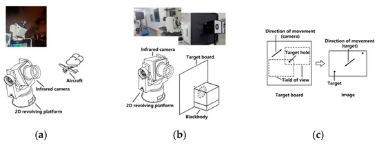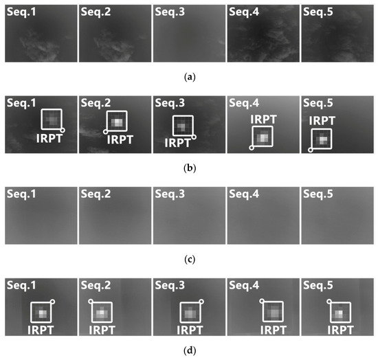 In order to measure the performance of the proposed method in this paper, we used MWIR 640 × 512 pixels Integrated Detector Dewar Cooler Assembly to obtain experimental data. Table 2 provides an overview of its specifications. In this letter, IRPT we mainly study is space target or aircraft. Therefore, we obtained sky background and deep space background with their IRPT as experimental data, as shown in Figure 5. In Figure 5, the scenarios from the top row to bottom row are sky background, sky background with IRPT, deep space background, and deep space background with IRPT, respectively. Each data set has five sequences, and each sequence includes 150–200 frames. Figure 6 shows the details about the acquisition of experimental data. In these data sets, the sky background and its IRPT are the real shots of the sky and the aircraft as shown in Figure 6a; However, the deep space background and its IRPT are simulated by blackbody and target board as shown in Figure 6b. In Figure 6c, the blackbody penetrates the target hole to form an IRPT. Then, we can control the field of view movement in a certain direction by moving the camera. In the image, the IRPT will move in the opposite direction of the camera movement.