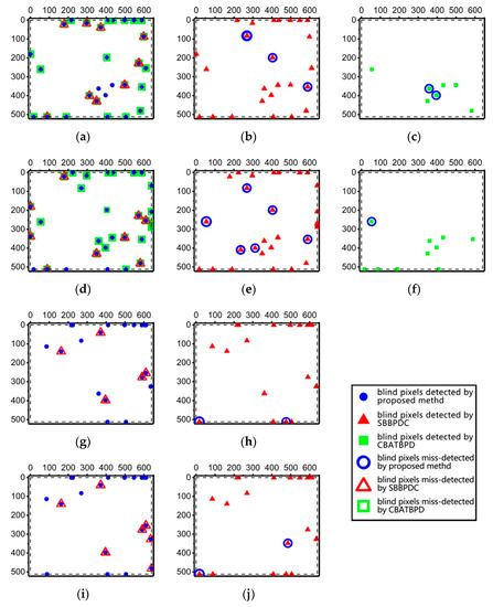 The blind pixel maps of the first sequence of each scenario detected by different methods (a) Background: sky Method: the proposed method; (b) Background: sky Method: SBBPDC; (c) Background: sky Method: CBATBPD; (d) Background: sky with IRPT Method: the proposed method; (e) Background: sky with IRPT Method: SBBPDC; (f) Background: sky with IRPT Method: CBATBPD; (g) Background: deep space Method: the proposed method; (h) Background: deep space Method: SBBPDC; (i) Background: deep space with IRPT Method: the proposed method; (j) Background: deep space with IRPT Method: SBBPDC.