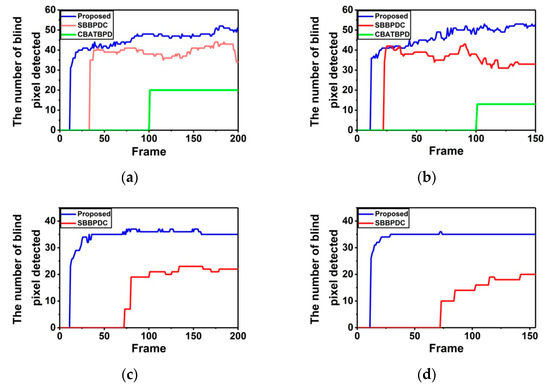 In Figure 8, we respectively plotted the number of blind pixels detected by the above-mentioned methods in each frame. Figure 8a–d illustrates the data of the first sequence of sky background, sky background with IRPT, deep space background, and deep space background with IRPT, respectively. It is obvious that the proposed method can detect more blind pixels with fewer frames compared with other methods. SBBPDC uses the keyframe to improve the detection accuracy and efficiency, which depends on the change of background. Therefore, the detection rate of SBBPDC tends to slow down in deep space because the change of background is not obvious. Additionally, CBATBPD needs hundreds of frames to ensure detection accuracy.