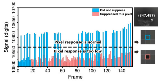 where refers to the frame amount that false suppressed of the flickering pixel. As is mentioned above, the evaluation of flickering pixel suppression uses simulation data. Therefore, the , , and in Equations (13) and (14) can be recorded during simulation.