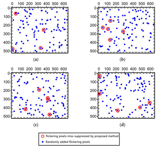 Meanwhile, we use the simulated data to make a quantitative analysis on the flickering pixel suppression. Figure 10 shows the randomly added flickering pixels and miss-suppressed flickering pixels of our method. Additionally, Figure 10a–d is sky background, sky background with IRPT, deep space background, and deep space background with IRPT, respectively. Blue points show the flickering pixels added randomly, red circles indicate the flickering pixels which miss-suppressed by our proposed method. We calculate the , , and mentioned in Section 3.2 of different simulated scenarios in Table 5. The results showed that there is no false suppression of flickering pixels in all scenarios. In addition, the miss suppression rate of flickering pixels is less than or equal to 2.38% in all scenarios.