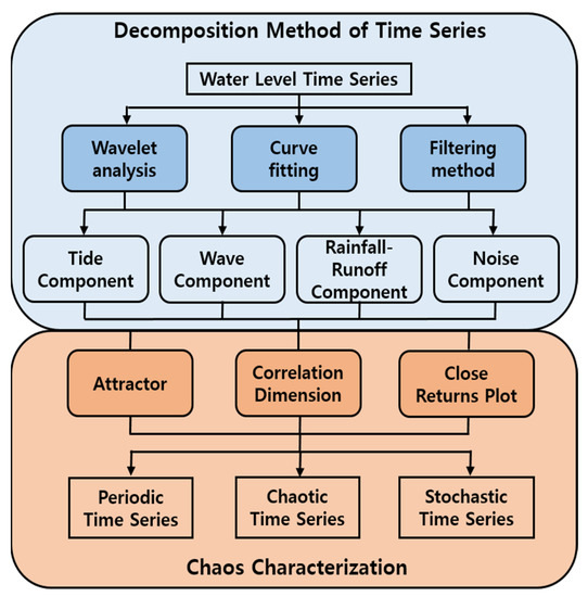 This study separated a water-level time series of tidal river into tide, wave, rainfall-runoff (or river stage), and noise level components as proposed by Lee et al. (2018) [2]. Additionally, we analyzed using each component time series for searching for chaotic characteristics. The methodologies for a water level decomposition and for the chaos analysis were described in this section. The flowchart and analysis method of this study is shown in Figure 1. First, the water level time series was decomposed into tide, wave, rainfall-runoff (or river stage), and noise components through wavelet analysis, curve fitting, and the filtering technique (see Lee et al., 2018) [2].