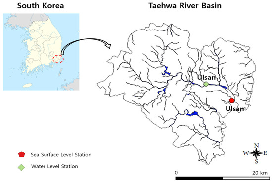 The study area is Taehwa river basin in Korea, and the water level time series measured at Ulsan station in the basin is obtained. Taehwa River basin is located in the south-eastern region of the Korean peninsula. The basin area is 646 km2 and average slope of the basin is 0.2770. The length of river is 47.54 km and the shape factor is 0.72, which shows a characteristic that peak runoff can be occurred in a short time. The west side of the basin is mountain area, so the river flows from west to east then meets the open sea in the estuary. The estuary is subject both to marine influences such as tides, waves, and influx of saline water and to riverine influences such as flows of freshwater and sediment. There are two Ulsan stations (Figure 2). One is for observing the sea surface level and the other is for observing water level of tidal river. Because the Ulsan sea surface level station is at the downstream end of the station for water level, the study area is deemed suitable for applying and verifying the proposed methodology.