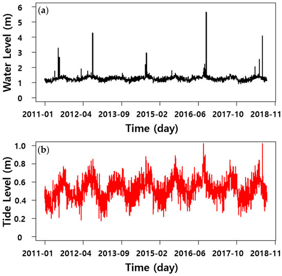The water level and sea-level time series from Ulsan stations are obtained at a daily scale (data size of 2891) from 1 January 2011 to 31 November 2018. The unit of data is daily data, and daily data have been observed stably without missing data since 2011. The water level time series shows the typical characteristics of a tidal river with high variation in low water level, and is also affected by rainfall (Figure 3a). Meanwhile, the sea level time series have low variation characteristics and are influenced by tides and waves.