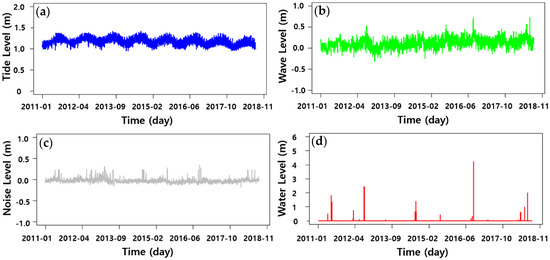 The water level time series from Ulsan gauging station was decomposed into four components of tide, wave, noise, and rainfall-runoff using the wavelet analysis and filtering technique proposed by [2]. The decomposition results are shown in Figure 4 and Table 1. Tide and wave components were separated through a sea surface level time series, and rainfall-runoff and noise components are defined as components excluding tide and wave components from the water level time series. A high pass filter is applied to separate these two components. In other words, the rainfall-runoff component and noise component were separated based on a certain threshold value, which reflects the characteristic that the water level rises rapidly when rainfall occurs. Therefore, rainfall-runoff shows a value of 0 in the no rainfall period, and has a certain value when the water level rises rapidly in the rainfall period.