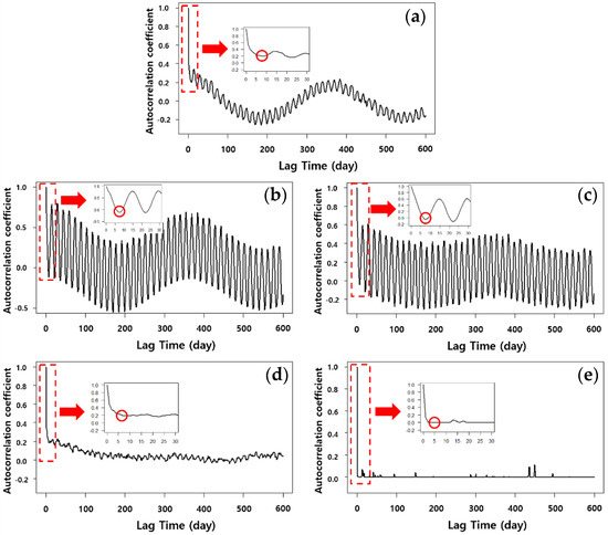 Autocorrelation function for each component: (a) water level, (b) tide component, (c) wave component, (d) noise component, (e) rainfall-runoff component.