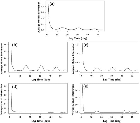 Average mutual information of each component: (a) water level, (b) tide component, (c) wave component, (d) noise component, (e) rainfall-runoff component.