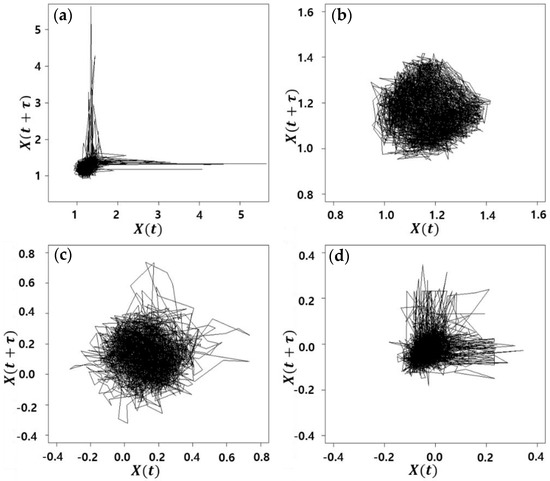 In reality, natural phenomena can be characterized as deterministic, stochastic, or chaotic, and the reconstruction of the phase space and the attractor could be used to identify characteristics of the time series. Packard et al. (1980) and Takens (1981) suggested the method of delays for the phase-space reconstruction of the time series [25,26]. A scalar time series is embedded into m-dimensional space by constructing the vectors as Equation (5):