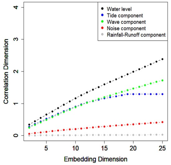 In determining whether each component has stochastic or chaotic characteristics, the correlation dimension was estimated. With the correlation dimension of 1.30, the tide component was influenced by two variables (mid-period and long period). As shown in Figure 9, only the tide component had a chaotic characteristic as it converged into a certain value, and the other components showed stochastic characteristics as they diverged. These results are significant in determining whether a linear model or a nonlinear model should be used to predict tidal river water levels with complex hydrological characteristics.