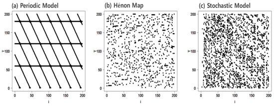Close returns plots (CRPs) for (a) the periodic model (), (b) the Hénon map (), and (c) the stochastic model ( when r = 0.01.