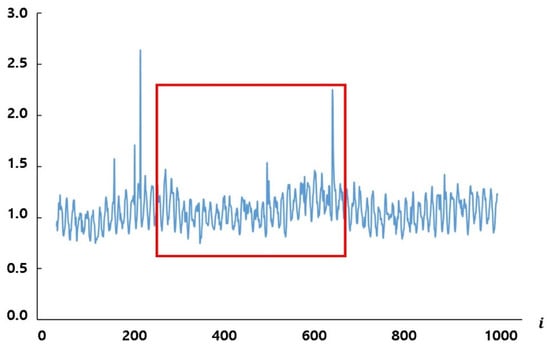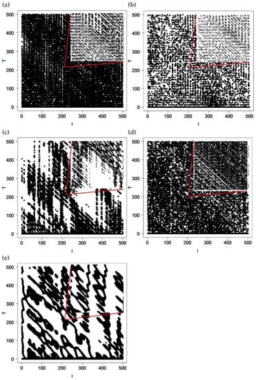 A close returns plot (CRP) is used for analyzing the chaotic characteristics of a time series in this study. The chaos system is characterized by complex and strange attractors on a phase space with the repeated occurrence of a periodic orbit. The analysis is based on the rule that, after a random time, the chaos system passes through the neighborhood point again [16,32]. For this, , indicated by the difference of the points in the time series, is used as in Equation (8):