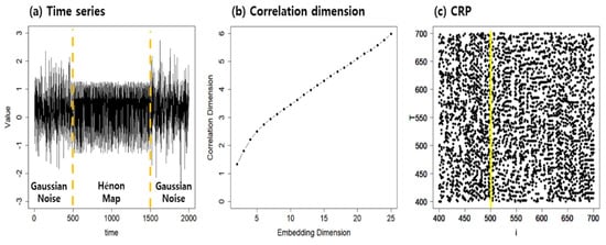 (a) Combined time series of Gaussian noise and the Hénon map; (b) correlation dimension; (c) yellow line represents the boundary between the Gaussian noise and the Hénon map.