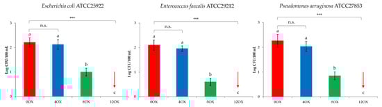 After bacterial inoculation, the cell densities of control ice samples (0OX) were 2.21, 2.10, and 2.26 Log CFU/100 mL for E. coli ATCC25922, En. faecalis ATCC29212, and P. aeruginosa ATCC27853, respectively. In more detail, Figure 2 shows that the antibacterial activity of the food ice activated with different concentrations of H2O2 was comparable among the different strains tested. No significant differences (p > 0.05) were found among the levels of microbial count for the trials 0OX and 4OX between the same bacteria strains, showing that the presence of 4 mg/L of H2O2 in the food ice did not exert any disinfecting action. In contrast, the counts of the three bacteria decreased significantly (p < 0.001) with increasing H2O2 concentration. In particular, E. coli ATCC25922, En. faecalis ATCC29212, and P. aeruginosa ATCC27853 decreased consistently in the 8OX trial and were not detected in the 12OX samples, showing the bactericidal efficacy of H2O2 at the concentration of 12 mg/L against both Gram-positive (En. faecalis) and Gram-negative (E. coli and P. aeruginosa) bacteria commonly searched in water to establish its drinkability [33].