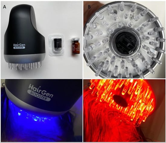 MND and LLLT protocol (A) Hairgen Booster® (DTS MG Co., Ltd., Seoul, Korea, #B108-147) device with HR3 Matrix Hair Solution Alpha® (DTS MG Co., Ltd., Seoul, Korea, #B108-147) and HR3 Matrix Hair Stamp® (DTS MG Co., Ltd., Seoul, Korea, #B108-147); (B) detail of HR3 Matrix Hair Stamp® inserted into the Hairgen Booster®; (C) blue light application (wavelength 423 nm) during the treatment; (D) red Light application (wavelength 640 nm) during the treatment.
