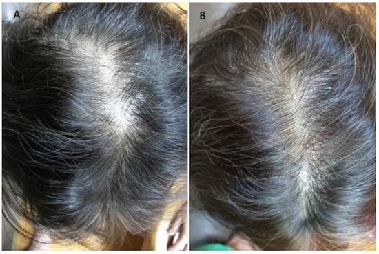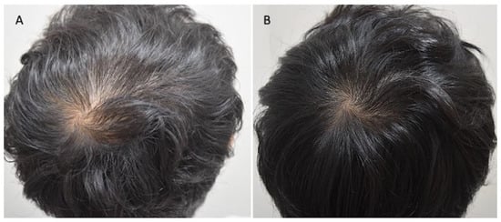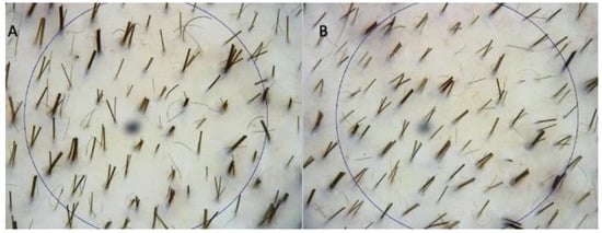Phototrichograms (Figure 4A,B) were taken of all scalps by a trained evaluator using FotoFinder video-epiluminescence microscopy (FotoFinder Systems; http://www.fotofinder.de, accessed on 1 July 2021) in combination with the TrichoScan digital image analysis (Tricholog GmbH and Datinf GmbH; http://trichoscan.com, accessed on 1 July 2021). TrichoScan is a digital software-supported epiluminescence technique for measuring the hair count (the number of hairs per 0.65 cm2), hair density (number of hairs per cm2), hair diameter, anagen-to-telogen ratio, and vellus hair-to-terminal hair ratio. To determine the quality of hair that led to an increased hair density, it is important to differentiate the number of terminal and vellus hairs. In the TrichoScan analysis, all hairs with a diameter > 40 μm were categorized as terminal hairs; those with a lesser diameter were categorized as vellus hairs. In all patients in both the treatment and control half-heads, the two targeted areas (TA) of HL were defined and marked with a semi-permanent tattoo for the subsequent trichogram. In the TA, hairs were clipped and dyed brown for 10 min to improve the hair contrast for the analytic software. The evaluator of the computerized trichogram analysis was blinded regarding the treatment and control areas of the scalp and was not involved in the administration of the treatment.