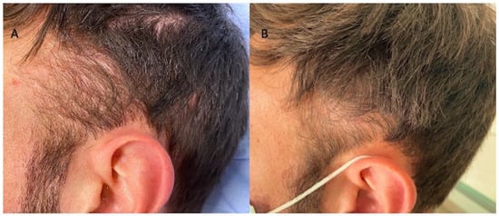 Caucasian male patients were treated with MND and LLLT protocols. (A) Pre-operative view of the scalp of 35-year-old male patient affected by AGA II according to Norwood–Hamilton scale with hair loss localized in the frontal, temporal, and parietal area; (B) post-operative view at T1-16 wks after MND and LLLT treatment with detail of HR-G in the temporal area.
