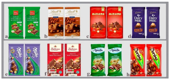 For the purposes of research, evaluation visuals containing food products (chocolate), the same ones found on store shelves, were created using the Illustrator CC program. The visual template was reproduced using Canon Image Press C 600 i, a calibrated machine for electro photographic digital printing which works on a toner powder principle. Coated paper for artistic printing (kunstdruck matt, weight 240 g/m2), 32 × 45 format, was used as a printing base. Prior to printing, the printing medium was conditioned in a room for 48 h in the prescribed standard ambient conditions (temperature 23 °C and relative humidity of 55%). The test sample contained a total of eight evaluated products (chocolate) with the corresponding numberings that were specified during the selection: (a) Fin Carre, (b) Lindt, (c) Zvečevo Mikado, (d) Dairy Milk, (e) Milka, (f) Bellar, (g) Alpinella, (h) Kraš Dorina (Figure 1).