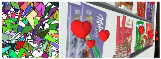 Respondents did not have prior access to templates. They were instructed to independently complete a questionnaire up to the part that ended with ranking the product on an analog template. Once the answers were collected, students were instructed, in the second part of the questionnaire, to use the tablet and scan the marker located on the back of the template. By scanning the 2D marker, the tablet displayed a digital AR visual with additional information that was not visible on the analog template. AR elements were heart-shaped in order to stimulate positive emotions in respondents, and at the same time not to avert attention from the product itself. The heart symbol was chosen because of its universality and subliminal emotional meaning. Additionally, in this way respondent’s attention stayed on the packaging, which was the main intention. There was an option that would give respondents the possibility to open every package of chocolate and reveal its inner design. However, that would mean that users distanced themselves from the overall package design. Therefore, 3D chocolates and hearts were chosen for this experiment. Additional AR elements did not cover some more important elements of the packaging design (brand name, chocolate image). It was made sure that key product information was clearly visible, as well as the product layout on the analog template. In this example, augmented reality provided the user with an interactive three-dimensional view of the initial 2D visual on a template, where the respondents were able to view products from all angles, rotate them, and study them in a more natural way than on an analog template. The appearance of the marker and the tablet display is shown in Figure 2.