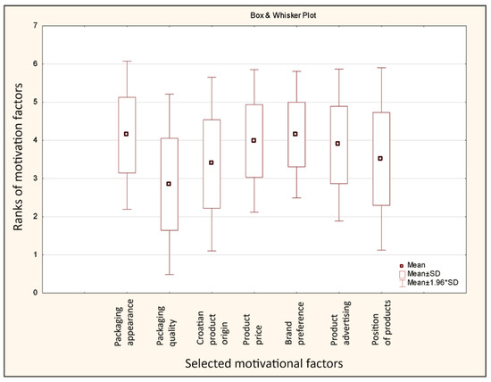 The aim of the statistical analysis is to determine the influence of a particular factor (statistical variable) on the selection and purchase of a particular food product. Waheed et al. conclude that the results indicate a significant effect of product packaging on consumers’ purchase intentions [11]. In their research, Maleki et al. conclude that packaging material influences some of the components of sensory expectations, brand attitude, quality and price perception, while graphic design influences most of those. Willingness to buy is more related to the packaging graphic design than to the material [18]. The majority of research dealing with the impact of packaging on product purchases comes to the conclusion that color has a major impact on the product selection itself [15,17,23,26]. This research was extended to other variables (apart from color, which had a great influence on product selection) that could also influence product selection. The impact of seven variables were analyzed: Packaging appearance, Packaging quality, Croatian product origin, Product price, Brand preference, Product advertising and Position of products on shelves. The respondents (n = 66) had the task of evaluating seven selected variables with repeated grades from the Likert scale ranging from 1 to 5. Below is a Box & Whisker results chart, which clearly shows the results of a survey questionnaire on motivational factors for the purchase of food products.