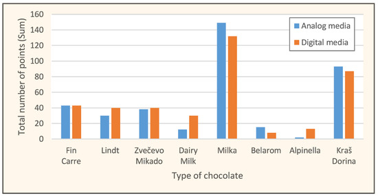 The respondents (n = 66) were given the task to make the first, the second and the third choice among eight offered products, first on the analog and afterward on the digital media. In similar research on a younger population (11–27-year-old respondents) authors explored how information and visual aesthetics of chocolate packaging influenced product selection. The results showed that an attractive package design was of paramount significance in the first instance when purchasing chocolate bars. The important factors which affected the buying decision were ‘Information’ and ‘Visual aesthetics’ [36]. For the purpose of statistical tests, points were awarded based on the results. A food product that was the respondent’s first choice was awarded 3 points, the second choice was awarded 2 points, and the third choice was awarded 1 point. The products that were not chosen by the respondent were awarded 0 points. Chocolates were indexed for better clarity and visibility: (a) Fin Carre, (b) Lindt, (c) Zvečevo Mikado, (d) Dairy Milk, (e) Milka, (f) Bellarom, (g) Alpinella, (h) Kraš Dorina.