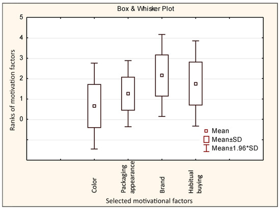 All groups had statistically significant differences (p < 0.05). This brought to the conclusion that the motivational factors which influence the purchase of chocolate products offered to the respondents through the analog media have the following order: 1. Brand, 2. Habitual buying, 3. Packaging appearance, and 4. Packaging Color (Figure 5).