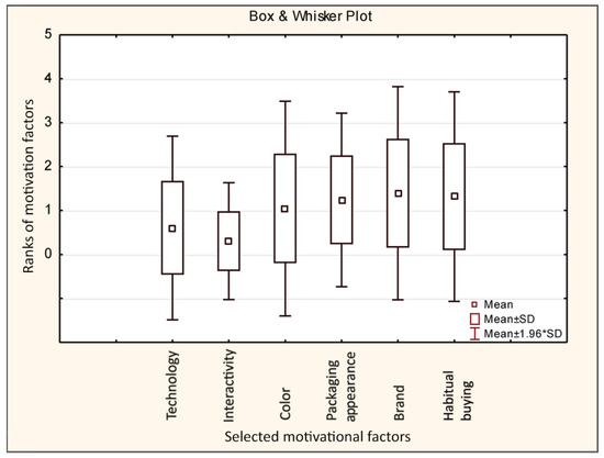 Wilcoxon tests indicated the existence of statistically significant median differences between the two groups of variables. Technology and Interactivity in one group of variables, while Color, Packaging appearance, Brand, and Habitual buying were in the other group. There were no statistically significant differences between the variables of Technology and Interactivity (p < 0.05). It should not be concluded that one of these two variables would have a stronger impact on chocolate customers’ motivation. Moreover, there were no statistically significant differences (considering the impact on customer motivation to purchase chocolate) between the variable pairs from the group that included the variables of Color, Packaging appearance, Brand and Habitual buying (p < 0.05).
