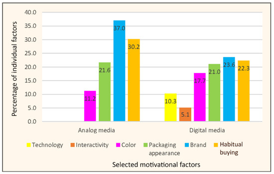 Firstly, a comparison of motivational factors was presented using percentage values relative to the total number of points for analog and digital media. Based on this, it could be seen how the existing four variables (Color, Packaging appearance, Brand, Habitual buying) changed the value by adding two new variables (Technology, Interactivity) to the evaluation of all the motivational factors on digital media (Figure 7).