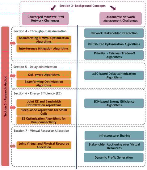 In this section, we explain two of the background concepts that are expected to become the pillars of future networks, namely utilizing mmWave networks to boost capacity and ANM as a conceptual framework to make use of the potential gains of AI/ML towards higher resource efficiency. The optimization of the converged fiber-wireless mmWave network resources is the focus of this study, and this brief introduction aims to highlight the motivation, the main concepts, and the technological enablers behind the solutions provided in the presented resource management papers from Section 4, Section 5, Section 6 and Section 7.
