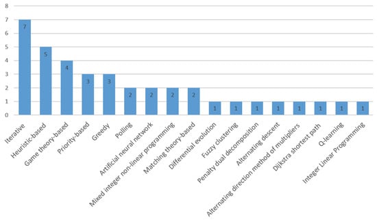 Regarding the first question, Figure 3 shows the distribution of the optimization algorithms used by the selected papers. Heuristic and iterative algorithms are frequently used in the literature, due to the fact that many optimization problems in this field are non-deterministic polynomial time hard (NP-hard) and thus require decomposition and simplification to create sub-optimal solutions which can then be solved with heuristic algorithms. Game theory and matching theory-based solutions are also attractive for distributed decision-making among entities, as centralized optimization is challenging in multi-stakeholder environments [42,43,44,45,46,47]. Finally, AI-based models (artificial neural networks (ANN) [48,49], Q-learning [50]) are also being utilized to resource management optimization problems. The distribution of the main performance metrics according to the resource optimization objectives is given in Table 1 and the objectives are also mapped to their sections in this review. Finally, the evaluation criteria to test the performances of the selected papers are grouped in Table 2, which shows how many times each criterion is used together with how many of the resource management objectives use these criterion.