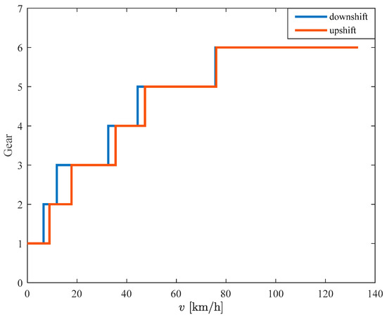 The gearbox model converts the wheel torque and speed to the corresponding ones at the input of the gearbox. A simple vehicle speed-based gearshift strategy is implemented in the model, accounting for the constraint of ICE maximum speed. Gearshift speeds are defined by analyzing the gearshift experimental data from Argon National Laboratory (ANL) Figure 3 shows the gearshift logic. To avoid frequent gear shifting, upshifts and downshifts are performed with a hysteresis that varies with the engaged gear.