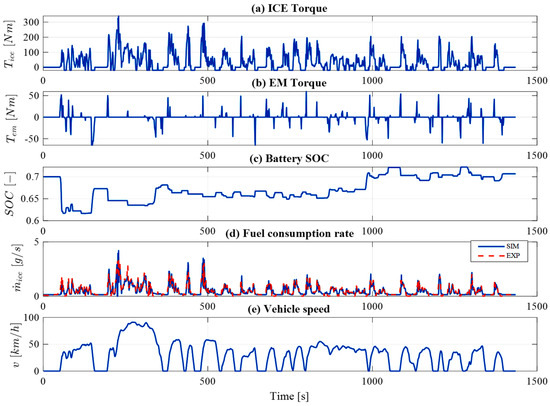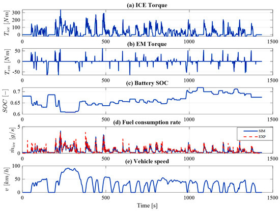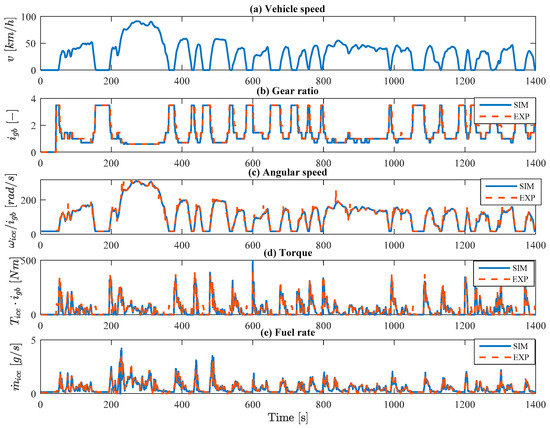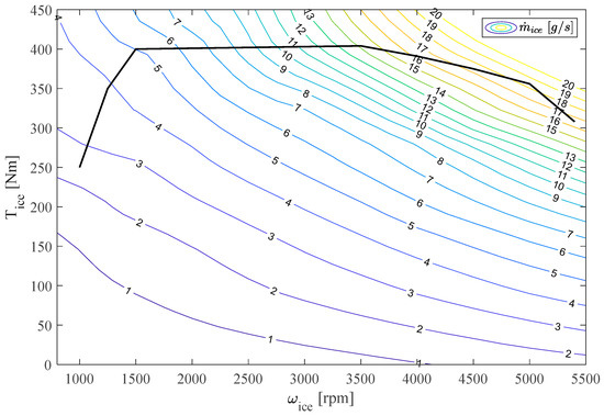 The fuel consumption map of Mazda CX9 2016 ICE used in the simulation is shown in Figure 4 as obtained from experimental data [32]. The adoption of a static map typically leads to an estimate of the fuel consumption that is usually lower than what is measured in dynamic conditions by means of a chassis dynamometer [36]. However, this difference is in the range of 1–4% depending on the driving cycle [36], with more aggressive driving cycles being associated with the upper bound of this range. In this paper, the extra fuel consumption due to transient operation is neglected.
