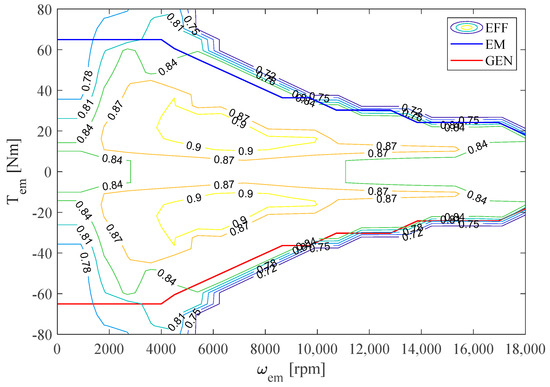 As shown in Equation (19), a necessary condition is to provide the required torque and request that the sum of torque contributions of two sources at the output of the gearbox be equal to torque demand at the same level. Moreover, the ICE and EM torques must be within the corresponding operating envelope: