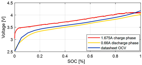 The middle blue curve shows the OCV as a function of SOC, as acquired from the datasheet. The red curve is the closed-circuit voltage at a constant charge load of 1.675 A. The yellow curve is the closed-circuit voltage at a constant discharge load of 0.66 A. It can be seen that the OCV taken from the datasheet approximates the true OCV at the mean of the closed-circuit voltages of the charge and discharge phases. The larger deviation of the charge phase results from the relative higher load with respect to the discharge phase.