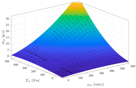 The mathematical model for ICE fuel consumption rate at a given operation point was obtained by steady state curve fitting of the engine map data (see Figure 10). The regression coefficients of the polynomial function (see Equation (18)) were estimated accurately since the goodness of this fitting indicated R-square = 0.9961.