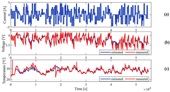 The experimental data consisting of a dynamic current (A) input, battery surface temperature (°C) and voltage (V) outputs were collected at room temperature from an NRC18650G-HOANA cell of 3200 mAh rated capacity. The dynamic current input was in the range of for both the charge and discharge phases. With the experiment conducted at ambient temperature, the estimated and the measured voltages were compared as in Figure 15b. The thermal model was equally validated, and the result is shown in Figure 15c.