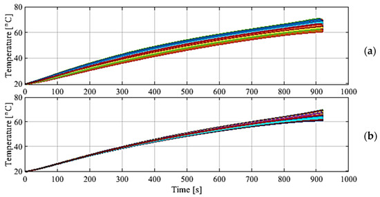 Surface temperature of cells in the 14 series, 6 parallel (14s6p) battery pack for: (a) initial SOC variation between 0.85–0.95; and (b) surface temperature dynamics of cells in the battery pack for capacity variation between 2.7–3.0 Ah.