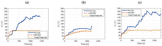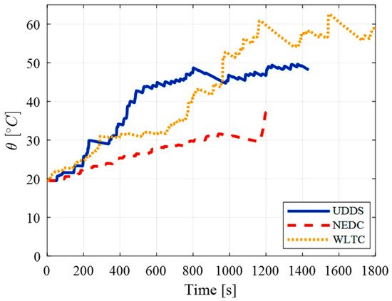 The temperature profile of the battery for UDDS, NEDC and WLTC driving cycles are given in Figure 20. For the case with no thermal limitations (blue, solid lines), the more aggressive cycles such as UDDS and WLTC have higher power demand, therefore, the temperature of the battery went up to 160 °C and 180 °C (Figure 20a,c), respectively. The temperature for the low power demanding NEDC cycle stayed within 85 °C (Figure 20b).