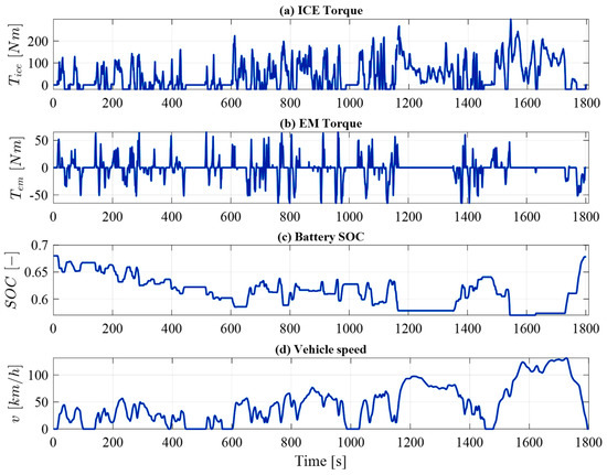 Simulation results with no thermal limitations for WLTC driving cycle: (a) ICE torque, (b) EM torque, (c) Battery SOC, (d) Vehicle speed.