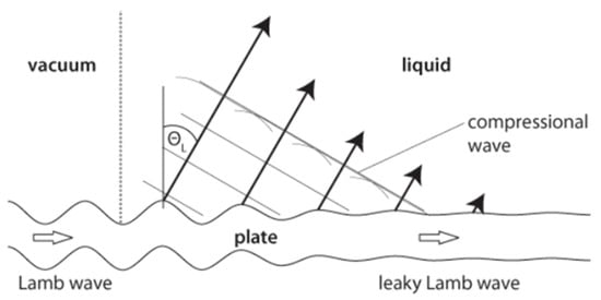 Lamb waves were first discovered by Sir Horace Lamb in 1917 []. Lamb waves are comparable to resonances resulting from the superposition of longitudinal and shear waves in thin plates. In free plates, Lamb waves can travel long distances that allow them to be a useful tool for long-range inspection. The Lamb modes can be separated into two categories: symmetrical (S) and antisymmetric (A). This denomination is based on the symmetrical nature of the displacement profile parallel to the surface of the plate. An infinite number of harmonics of the symmetrical and antisymmetric modes exist []. When a fluid surrounds the plate, a leaky attenuation appears as explained by Merkulov []. The energy of the Lamb waves is converted into compressional waves in the liquid as shown in Figure 1. Each Lamb wave mode is associated with an angle of re-emission (and by reciprocity to an angle of incidence, as explained later).
