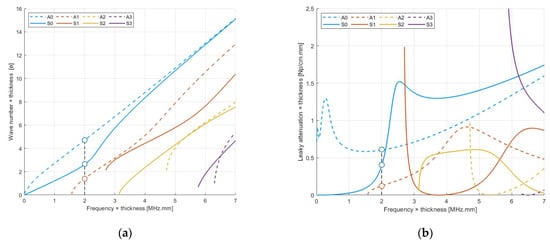 At a given frequency × thickness, several modes may coexist and propagate at the same time. For example, in Figure 2a, at 2 MHz.mm, the modes A0, S0, and A1 may propagate together. One can note in Figure 2b that the modes A0 and S0 present a high attenuation, whereas the mode A1 presents a lower leakage by re-emission.