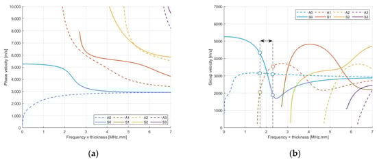 The phase velocity of the modes is evaluated using the real part of the wave numbers . The group velocity is derived from the phase velocity: , where . Both phase and group velocities are plotted respectively in Figure 3a,b. A real signal is never purely monochromatic. Its spectrum is defined by a band. That is why group velocities are of interest. In the example given by Figure 3b around , the modes have different group velocities. On the bandwidth, the group velocity of the mode A0 is rather constant, whereas the group velocity of the mode S0 varies by up to 100%. This highlights the dispersive property of the Lamb wave, described in detail in [].