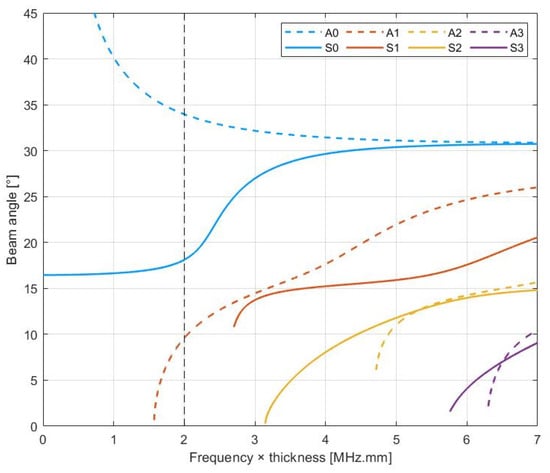 where is the beam incidence angle in the fluid, in the plate. is the wave velocity in the fluid. is the phase velocity of the aimed mode at a given product frequency × thickness. The beam angles in the case of our experiments are plotted in Figure 4. For example, at , the A1 mode can be generated by an incident wave with an angle of .